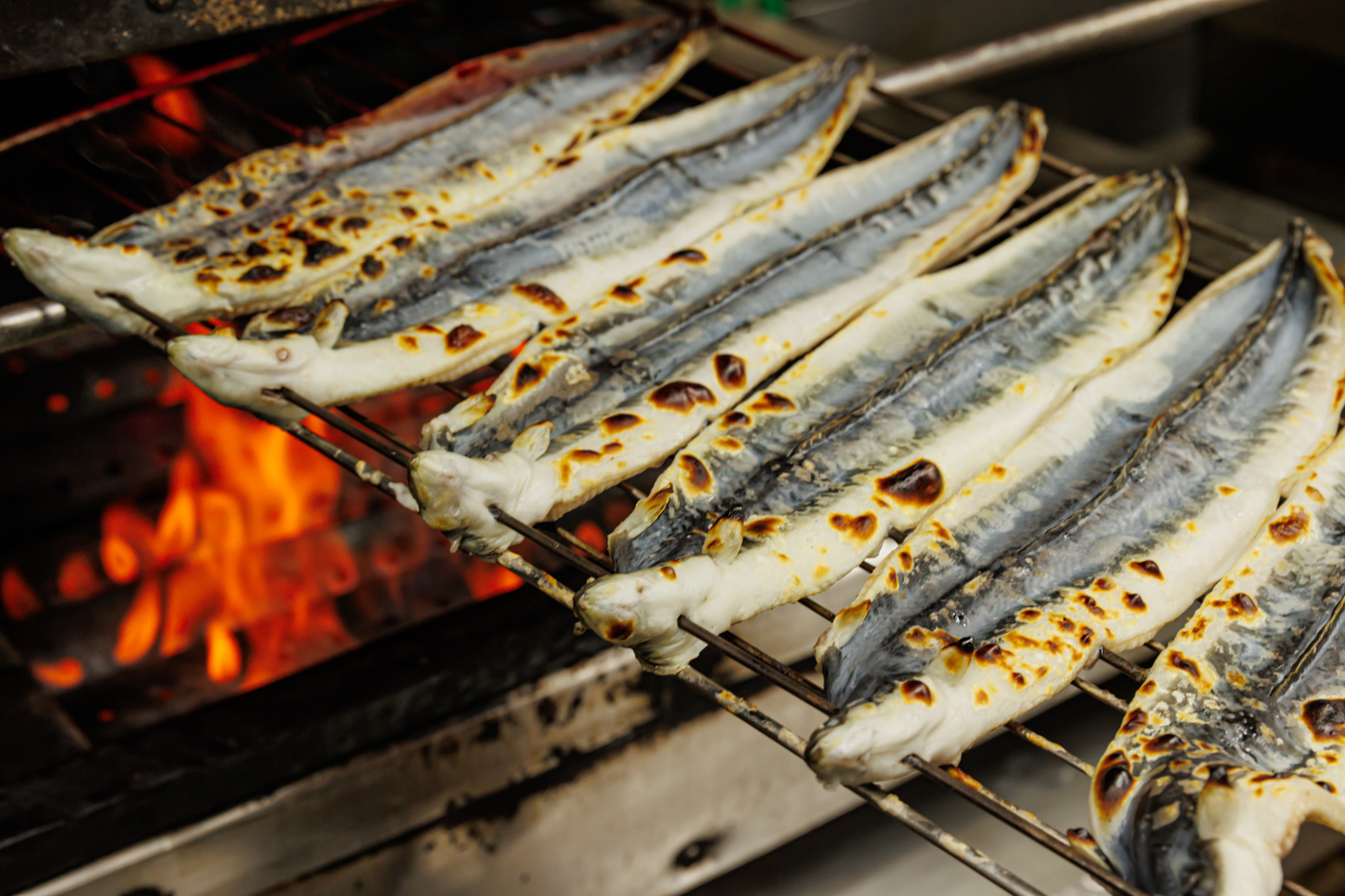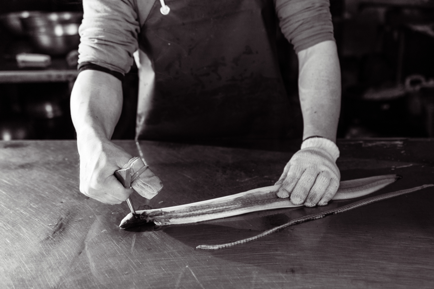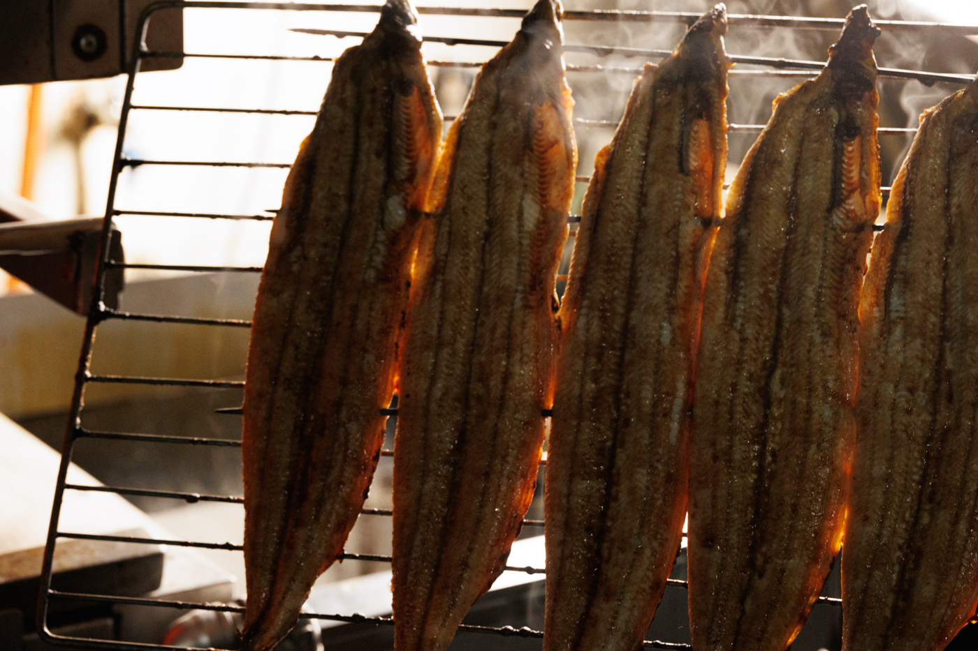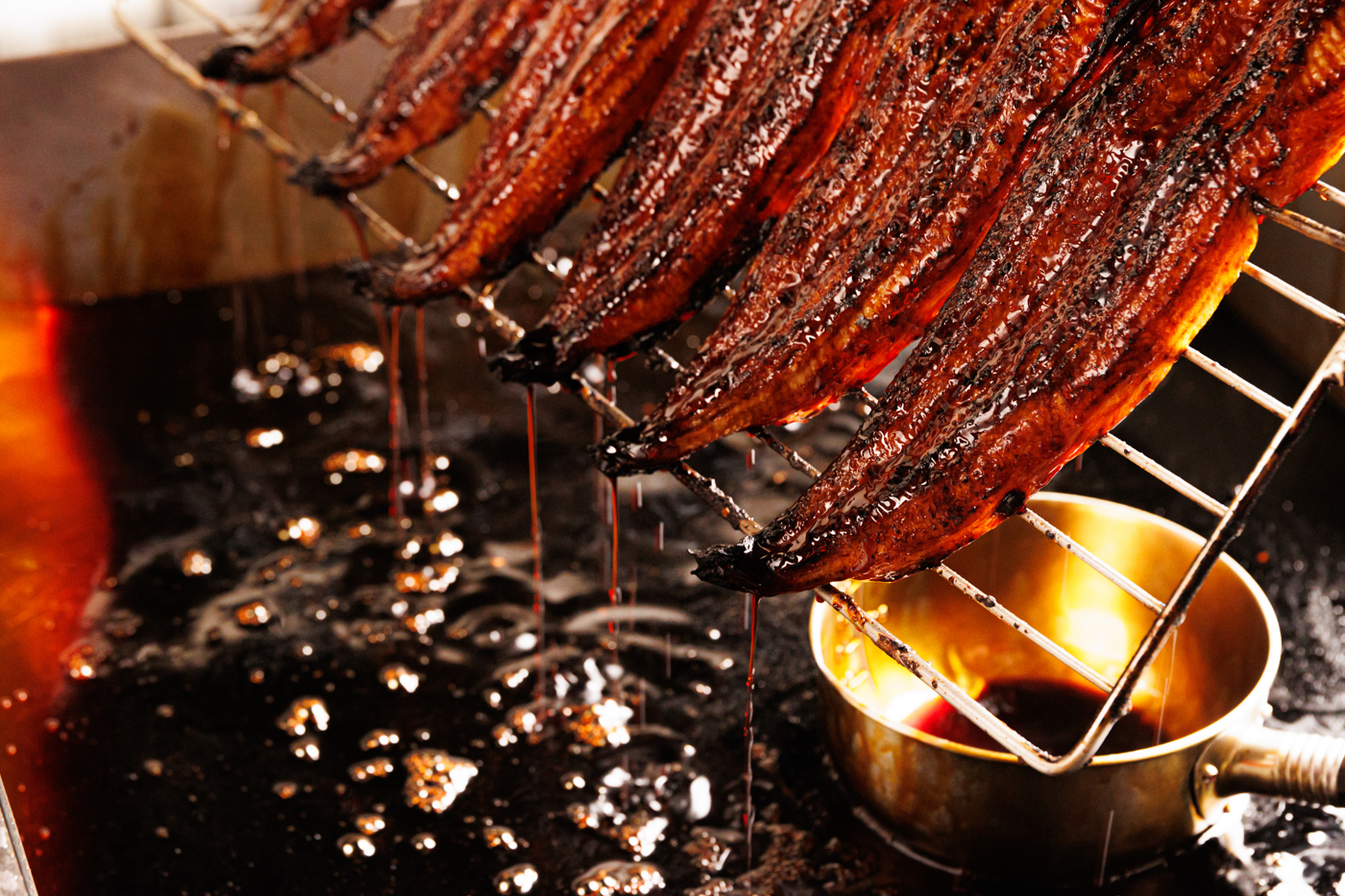 鰻を職人が串打ちシーンなど一本一本丁寧に手焼きしてる人物撮影など